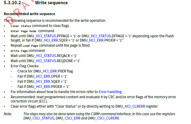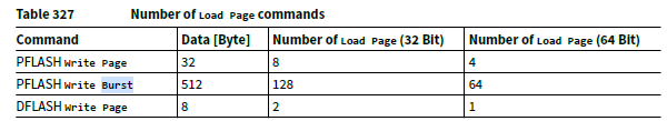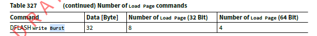 - Dflash的page大小为8 Bytes,单次执行写入(载入)只能为1个page(write page)或者4个page(write burst)。