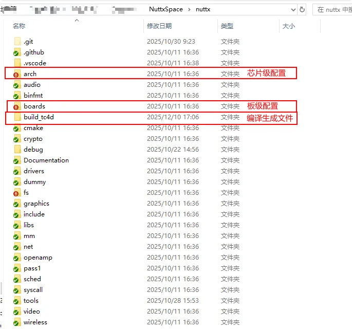 arch目录,里面包含NuttxOs适配不同Mcu的驱动文件,通常不太需要修改;