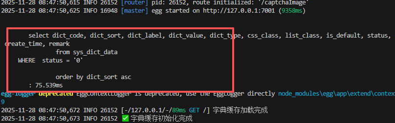 在开发过程中,了解每条 SQL 的执行性能至关重要。ruoyi-eggjs-mysql 插件内置了智能的 SQL 执行监控功能,每次执行 SQL 时都会在控制台实时输出执行信息,让性能优化变得一目了然。当你执行任何数据库操作时,插件会自动在控制台输出:
