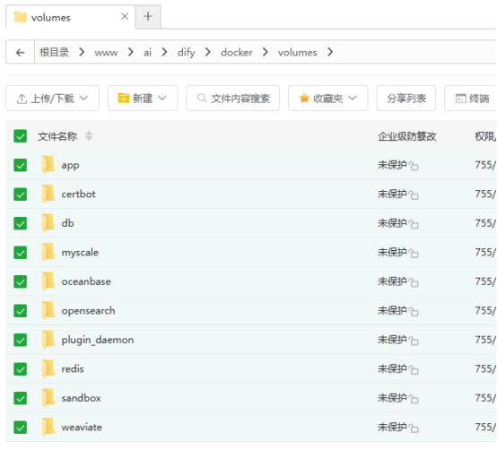 重要提示: Dify 的所有数据(知识库、对话记录、配置等)都保存在 /docker/volumes 目录。
