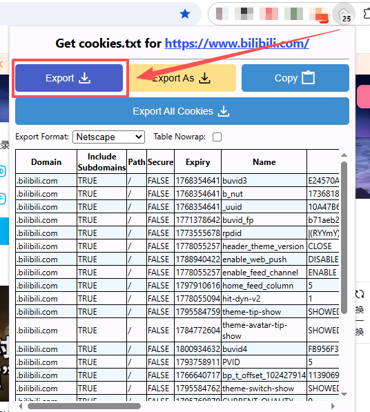 这里我们用到了 Chrome 浏览器插件:Get cookies.txt LOCALLY,打开哔哩哔哩网站 https://www.bilibili.com/,