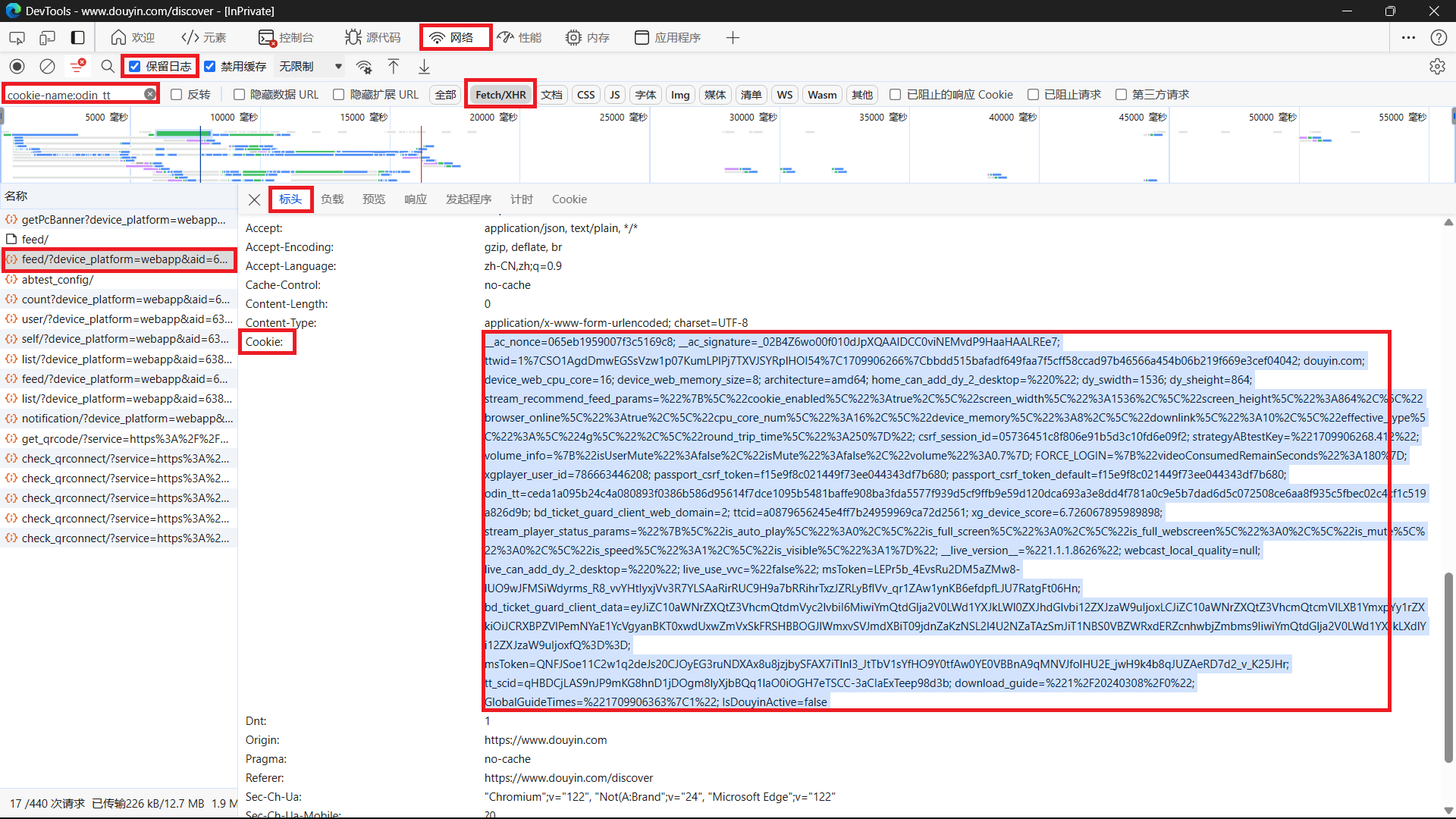 - 在 筛选器 输入框输入 cookie-name:odin_tt