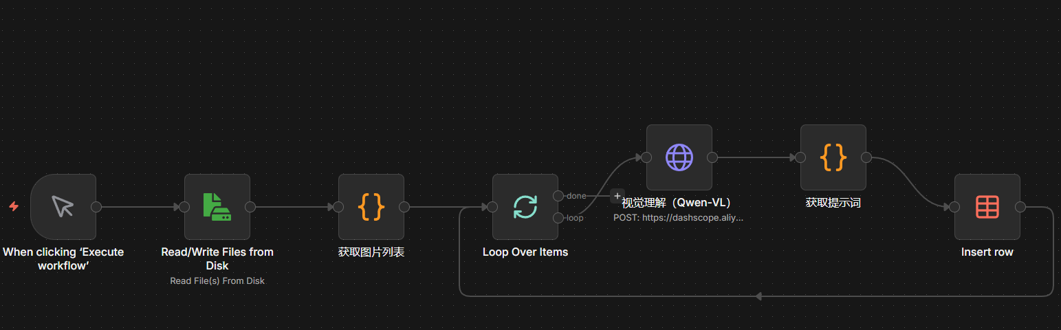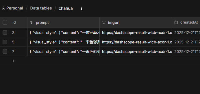 这里我们使用阿里的视觉理解(qwen3-vl-plus)模型来根据图片生成提示词,并保存到 n8n 的 Data tables 中。