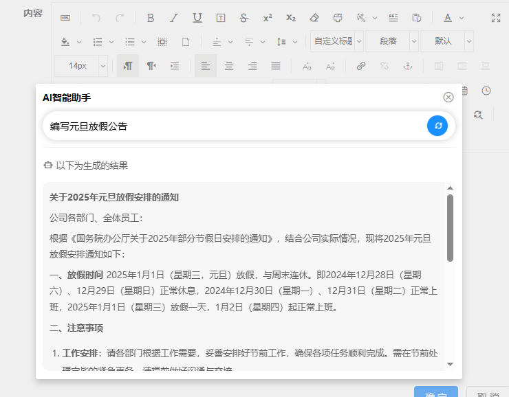 基于 UEditor 二次开发的富文本编辑器,全新的UI外观,支持文档一键导入,最新版本新增了AI功能,支持富文本续写、内容优化、内容生成等功能