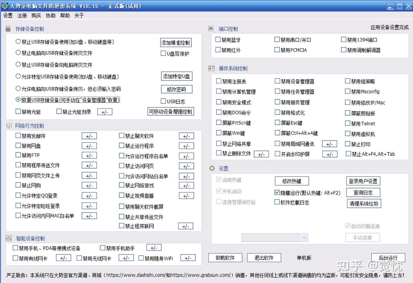 以比较知名的大势至电脑文件防泄密系统(http://www.dashizhi.com)为例,启动软件后如下图