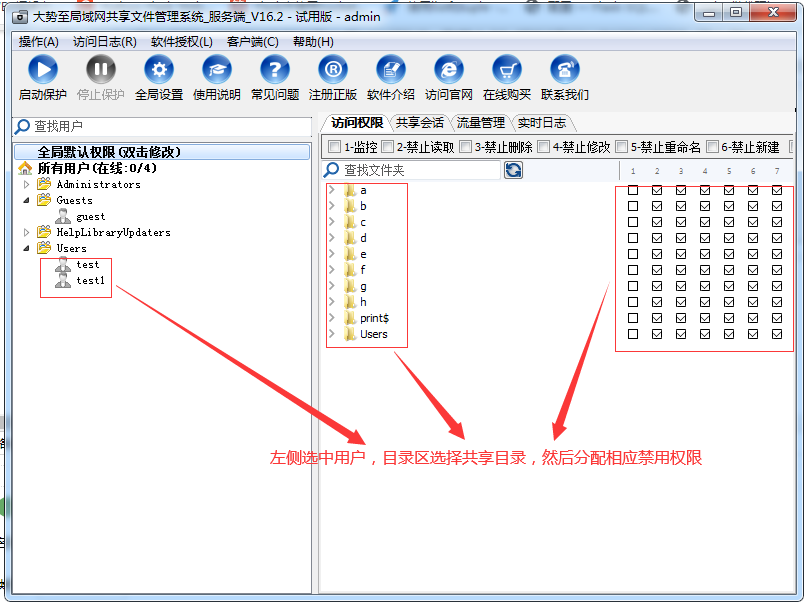大势至局域网共享文件管理系统(国内使用最多)、亿赛通、明朝万达:国内专业数据防泄漏方案。其中,大势至局域网共享文件管理系统(dashizhi.com),只需要在共享文件服务器上安装之后,就可以通过驱动的访问行为识别,来控制共享文件访问权限,可以实现只让删除共享文件而允许修改,只让打开共享文件但禁止复制、另存为、打印、拖动等,有效保护服务器共享文件的安全,设置比较简单。如下图: