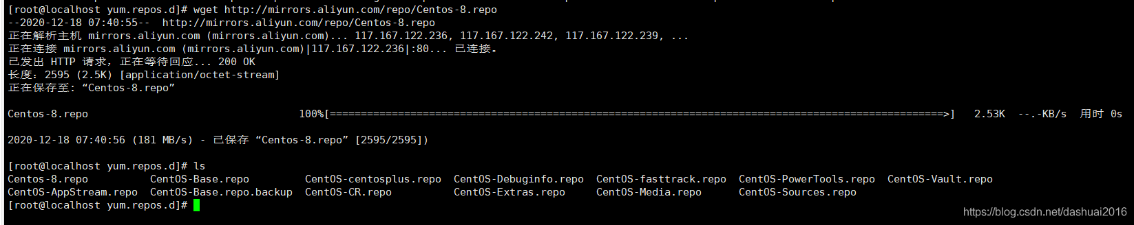 操作:wget http://mirrors.aliyun.com/repo/Centos-8.repo