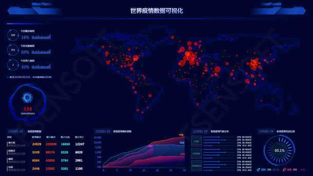 世界疫情可视化大屏:通过多种维度展示,利用丰富的图表,我们就可以直观地感受到世界的疫情分布情况以及确诊疑似治愈等重要信息,也能感受到,应对疫情防控,各地已取得了显著成果。