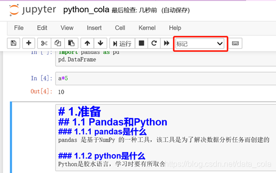 Jupyter默认是代码模式,不过也可以改成markdown模式,这时就变成了一个文本框,可以用来输入文本,# : 一级标题;## : 二级标题;### : 三级标题