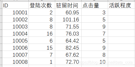 上述人才优秀程度评定的例子是建立在数据在同一区间,也就是所有的打分都是在0-100分之间,图片所示的是更多的情况下,数据范围各不一致,假设我们要分析一个网站某一天的用户活跃程度,通过用户登陆网站次数、主流时间(秒)和点击量三个指标来得到一个综合值。
