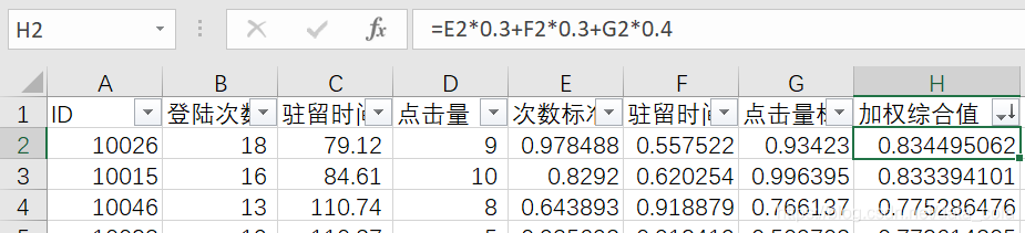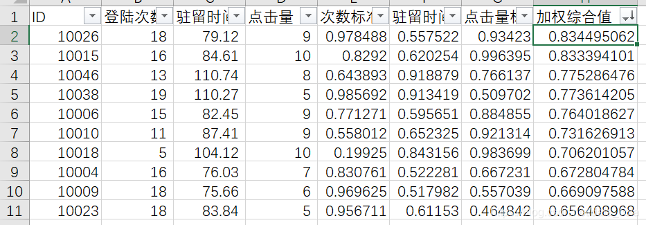权重的确定方法就不细展开了,这里只是提供一种做法,当把登陆次数、驻留时间和点击量都标准化以后,就可以分配权重并得到一个新的综合值了。