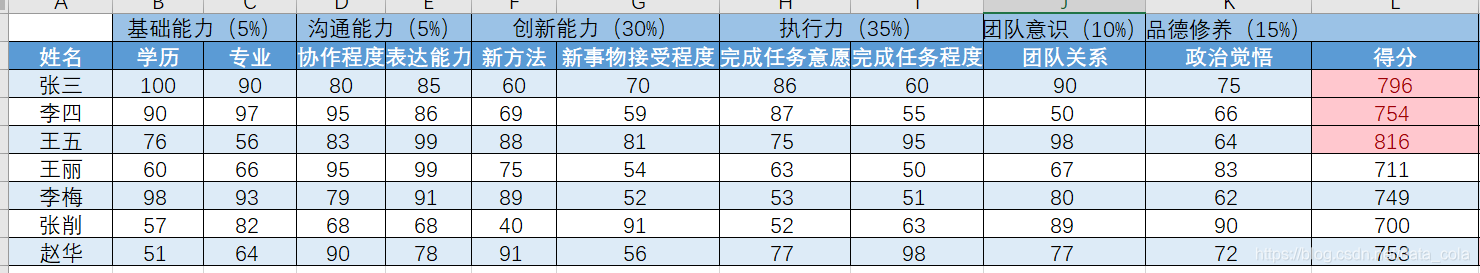 当确定好需要哪些指标以后,就将反映指标的数据填充进去。将每个人的相应指标下的打分结果(0-100分)填充进去。我们还可以直接求和计算其得分,图片中红色背景填充的为top3项。