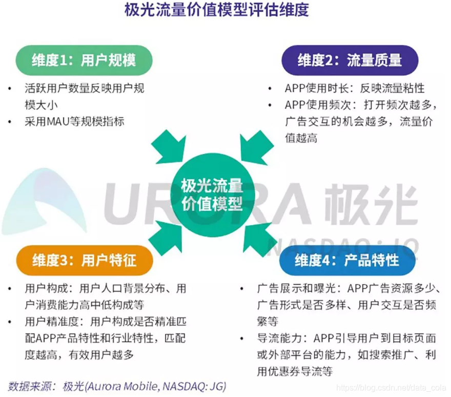 极光数据在2019年8月19日发布的APP流量价值评估报告中,就用到了综合指标分析方法。首先构造了流量价值这个综合指标,然后从四个维度:用户规模、流量质量、用户特征和产品特性分别选取相应指标。