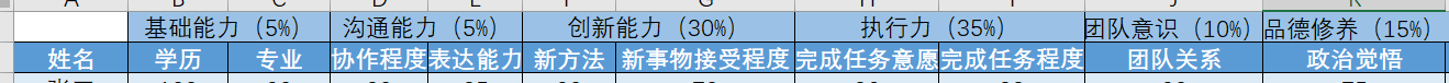 依据历史经验,我们将赋予每个指标相应的权重,如下图所示,基础能力5%的权重,执行力35%的权重等,权重相加应为100%