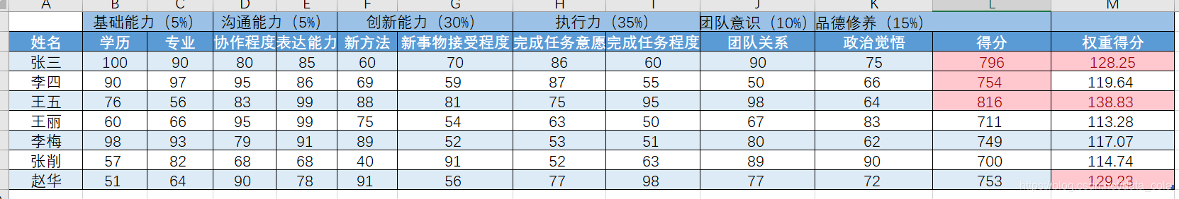 加权以后的综合值和不加权的值有什么区别呢,我们同样把加权以后的得分前3项标红了,可以看出来原本得分排名第三的李四因为在加权以后排不上前三了,区别就在于权重。