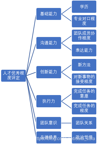 在确定指标的过程中,其实我们用到了一个数据分析的思维方法,或者叫一个数据分析模型,那就是逻辑树。逻辑树模型是将一个问题层层分解,找到末端原因所在的一个方法,因其长的像一个树状的结构,所以叫逻辑树。如我们设置人才优秀程度的评定方法,第一层从基础能力、沟通能力、创新能力等5个方面来评价,第二层将涉及这几个方面的指标相互独立地罗列出来,逻辑树的关键在于找到末端原因