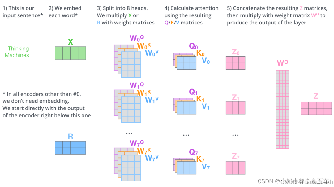 我在尝试实现多头注意力机制代码时,在网上发现了俩种对多头的解释,一种是(假设有8头)生成8份不同的Wq,Wk,Wv ,x与他们相乘后就有8份不同Q,K,V。再进过softmax,得到Z0,Z2,.....,Z7,把这些Z拼接起来变成一个大矩阵,再乘以Wo,把Z投影到原来维度。过程就如下图: