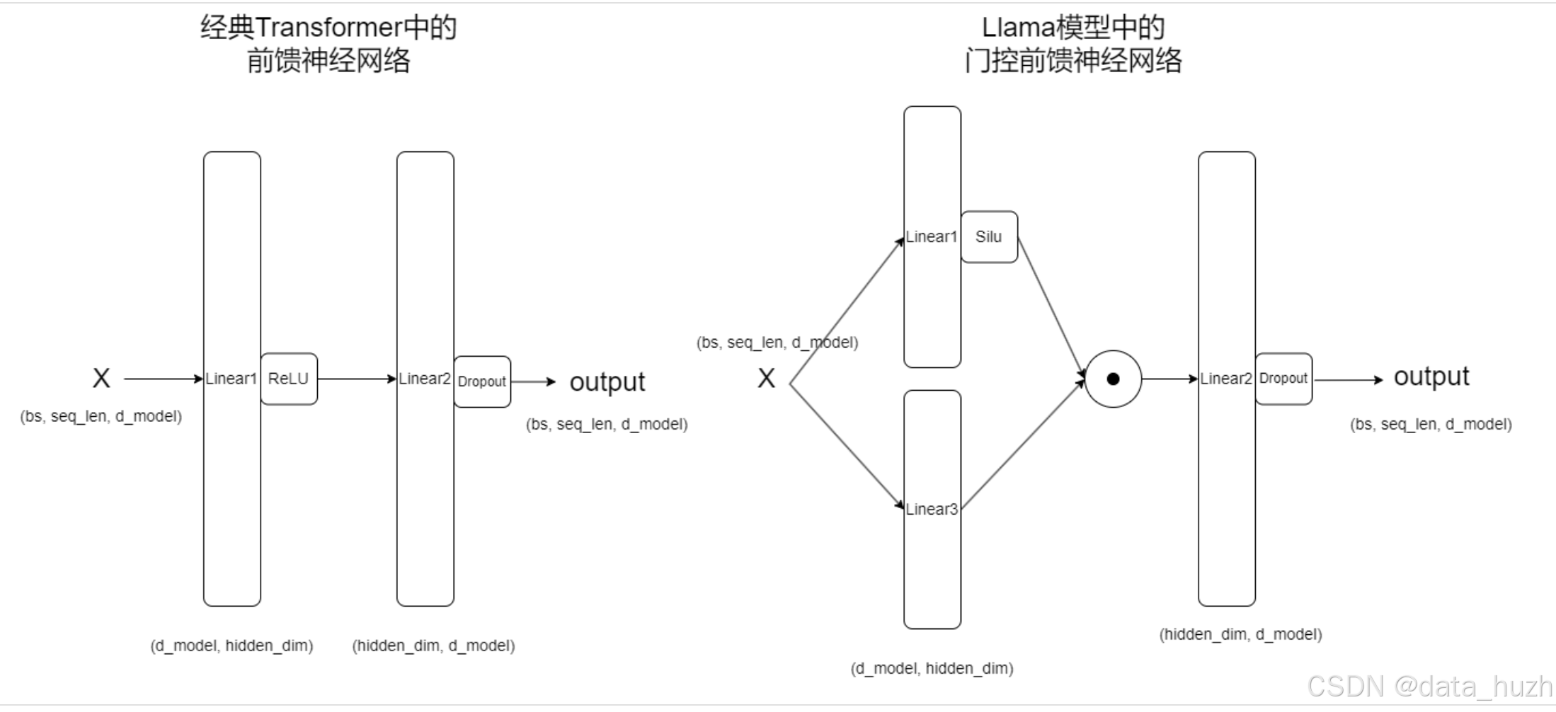 llama中的前馈神经网络:output = Linear2(Silu(Linear1(x))Linear3(x))