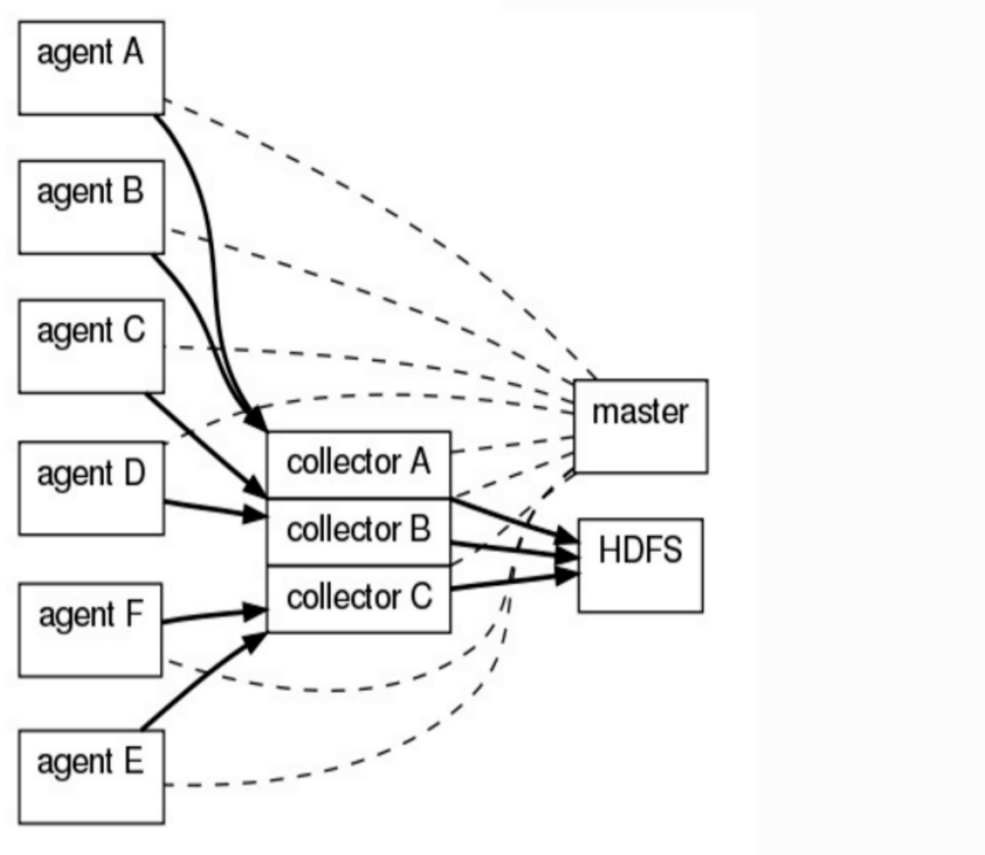 Flume OG由三个角色节点组成:agent,collector,master组成。agent负责从数据源收集数据,将数据集中到collector,然后汇入数据库,主节点master负责管理,在OG版本使用中,使用稳定性依赖于zookeeper。