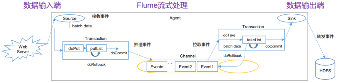 将数据推入临时缓冲区takelist,并发送到HDFS,如果数据全部发送成功,则清除临时缓冲区 takelist,数据发送过程中如果出现异常,rollback 将临时缓冲区 takelist 中的数据归还给 channel 内存队列。