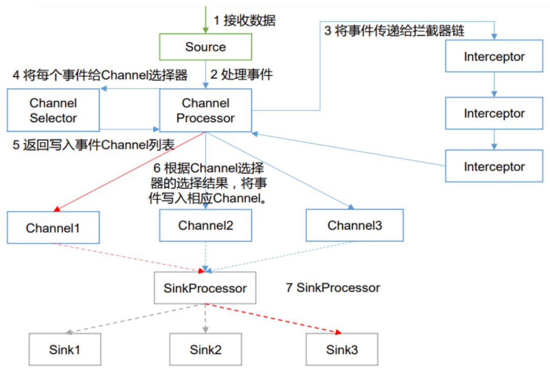 在Source接收到数据后,会把数据包装成Event,并把数据交给channel,由ChannelProcessor决定怎么交,交给谁。在ChannelProcessor流程中首先会将数据交给拦截器链,可进行数据清理,处理脏数据。拦截器尽量选择简单的逻辑,不然会影响流式处理链条,整个流程都会变慢。后将数据交给Channel选择器ChannelSelector,ChannelSelector处理完将数据返还给ChannelProcessor,根据ChannelSelector的选择结果将数据写入对应的channel。