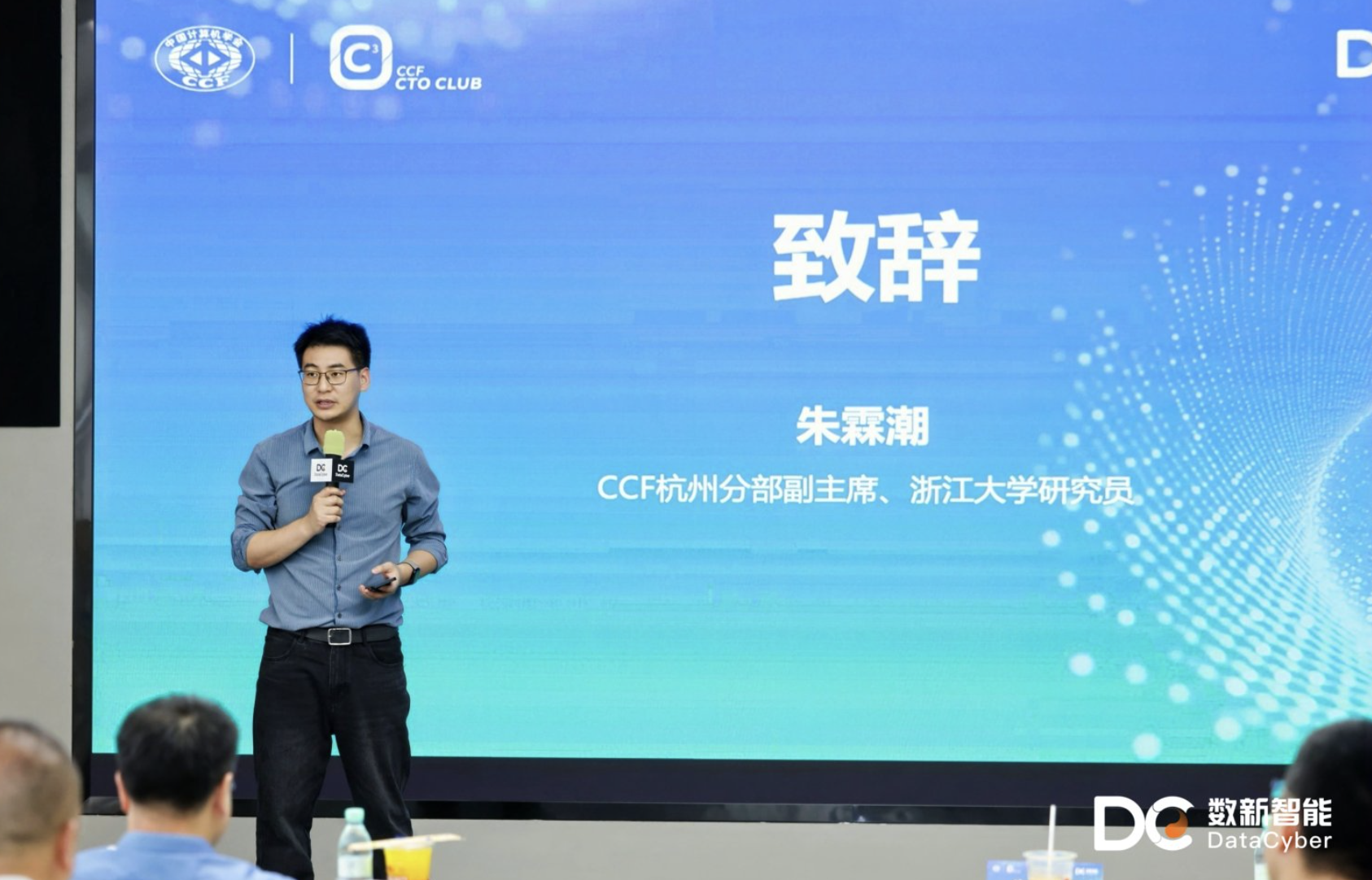 CCF 杭州分部副主席朱霖潮老师代表学会为活动致辞。他阐述了 CCF 在推动多模态数据融合技术交流与发展方面的使命担当,强调了学会作为计算机领域知识传播与技术创新重要平台的价值。朱老师的致辞不仅为活动注入了学术权威性,更激励着在场从业者携手推动技术进步;同时,这也彰显了学会引领行业方向、促进产学研深度合作的积极愿景。