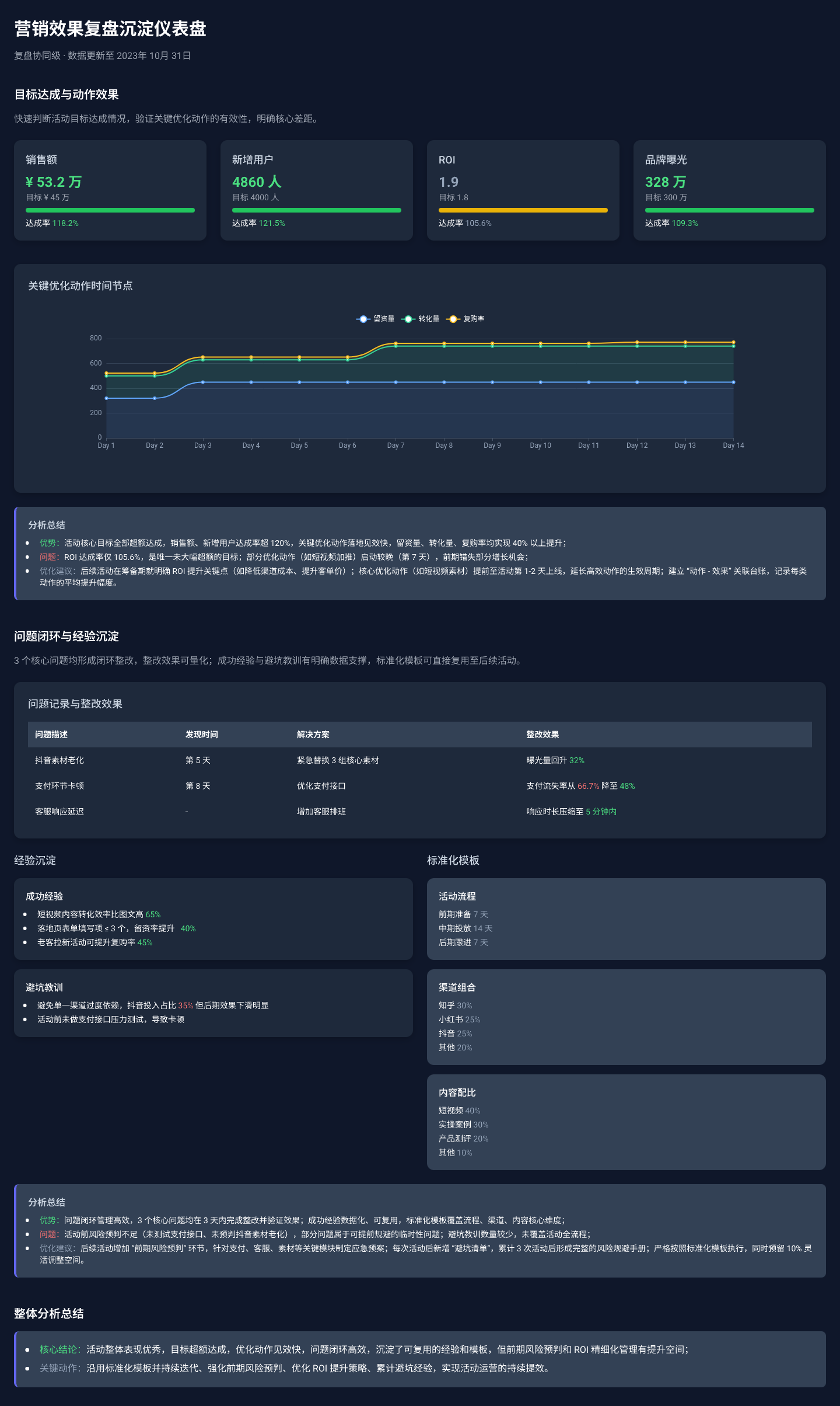 活动复盘的核心是 “从数据到洞察,从洞察到行动”,只有将数据转化为可复用的经验与方法,才能实现营销能力的持续迭代。借助助睿 BI 搭建复盘专属看板,整合活动目标、执行数据、优化动作、最终成果等全链路信息,形成可复用的复盘模板,让成功经验沉淀为标准化方法,后续活动直接参考复用。