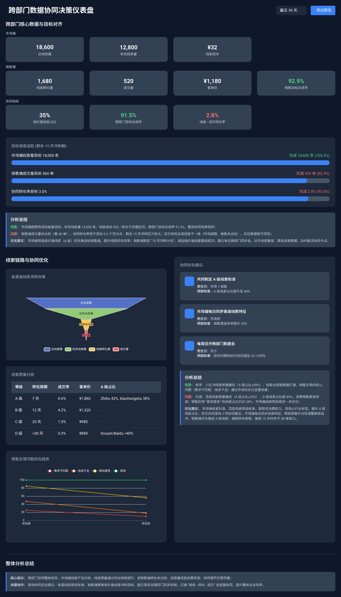 跨部门协作的核心是 “数据同源、目标对齐”,打破市场与销售的信息壁垒,才能实现线索从获取到转化的全链路优化通过助睿 BI 打通市场投放数据与销售转化数据,生成跨部门协同看板,市场端可直观看到渠道带来的线索质量、销售端可明确高价值线索的来源特征,双方基于同一套数据对齐目标,提升整体业务效率。