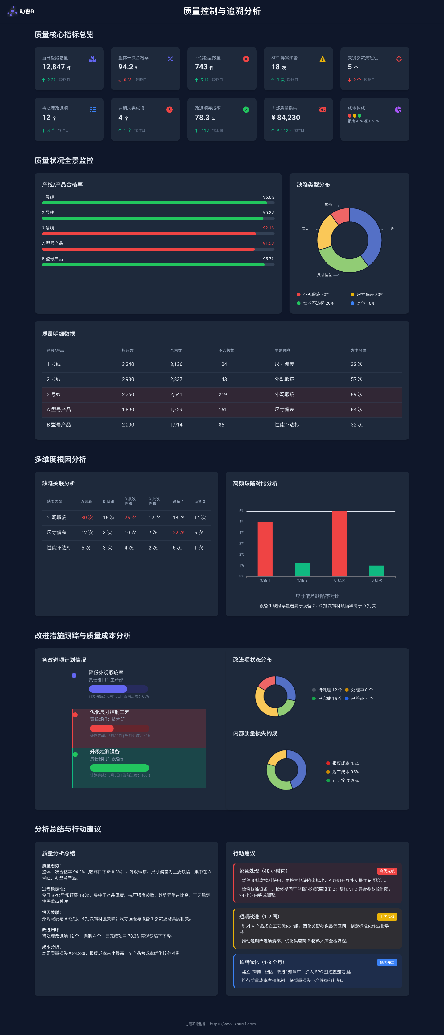 建立基于数据的质量分析与追溯闭环是破局关键。助睿BI能够将来自质检、生产、物料等系统的数据关联起来,帮助质量团队快速定位根本原因、量化改进效果,形成管理闭环。