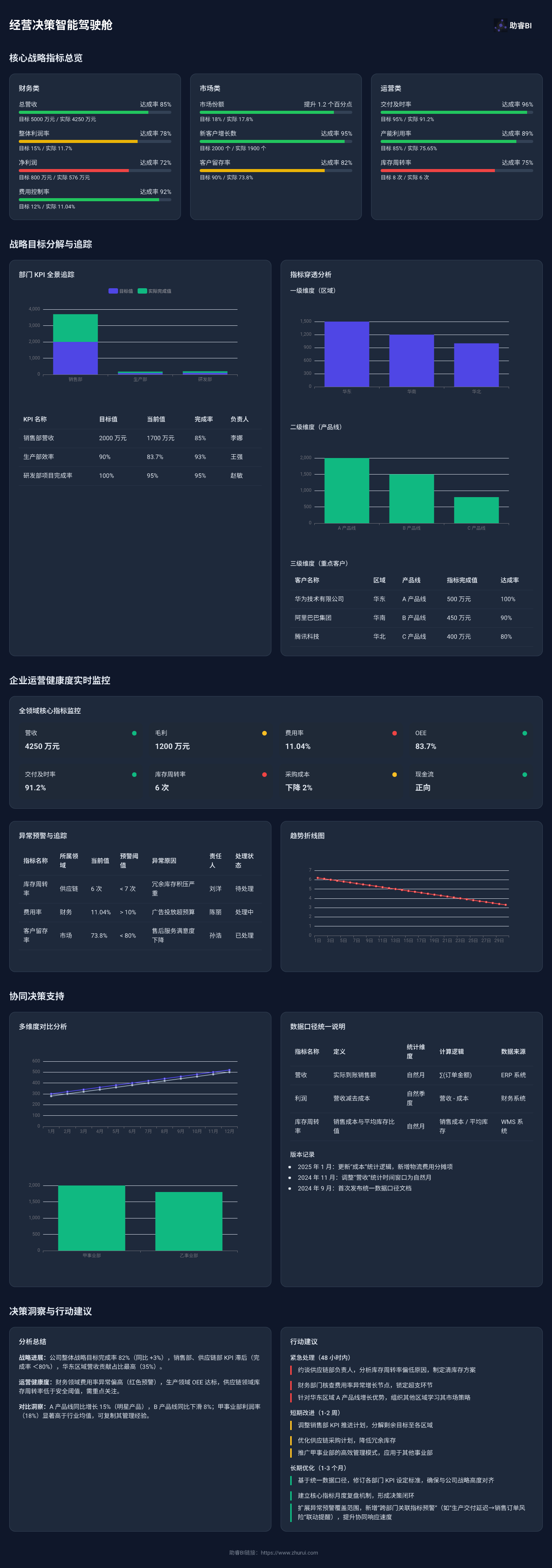 集团级战略地图:将公司级战略目标(如营收、利润率、市场份额)分解为各事业部、职能部门的关键绩效指标(KPIs),并在一个页面上动态展示目标值与完成进度。