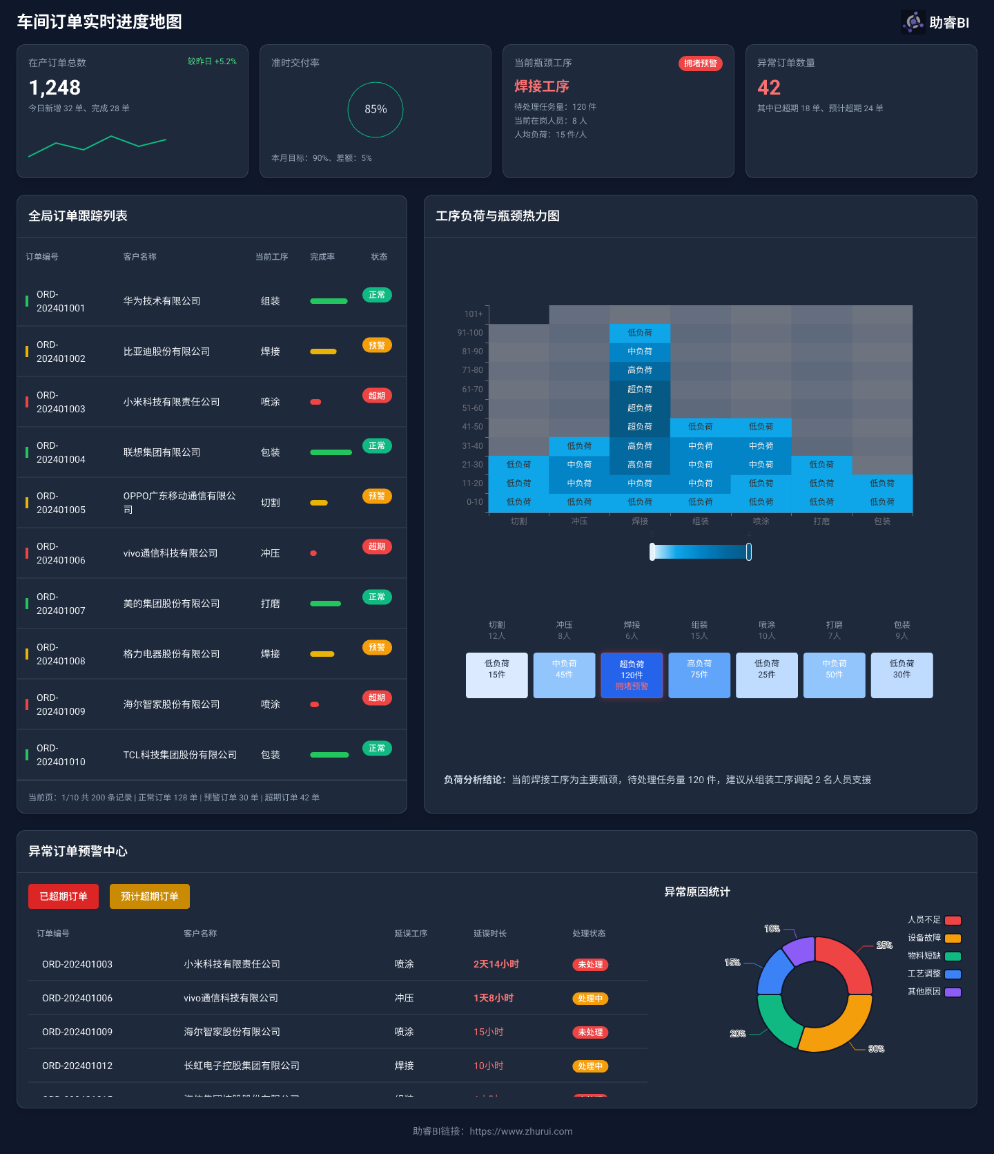 通过助睿BI连接这些报工数据,结合订单计划,你可以快速搭建一个可视化看板。这张“地图”通常包含三个核心战区: