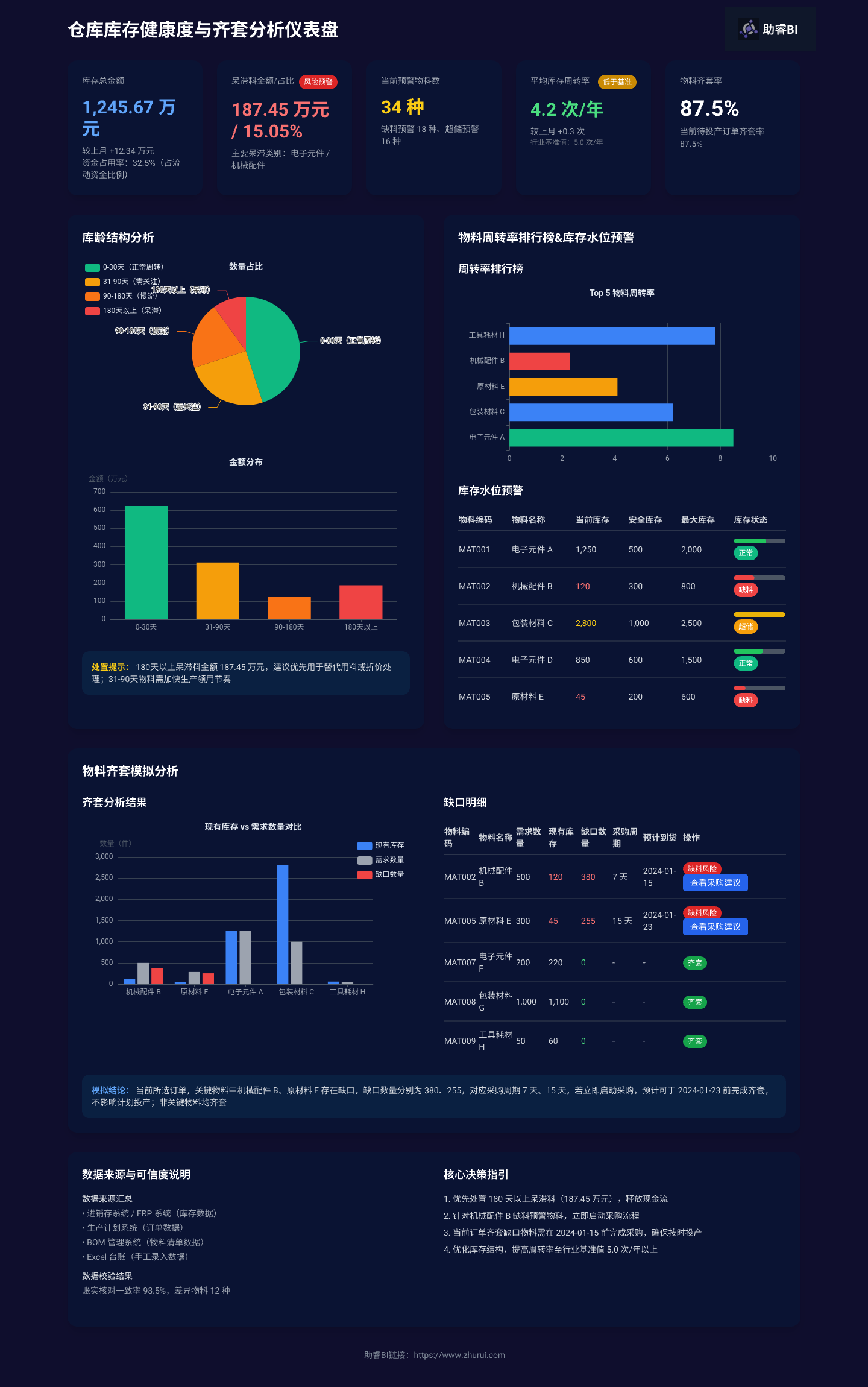 解决方案:构建库存健康度与齐套分析看板,让每一颗螺丝钉的价值和状态都清晰可见。