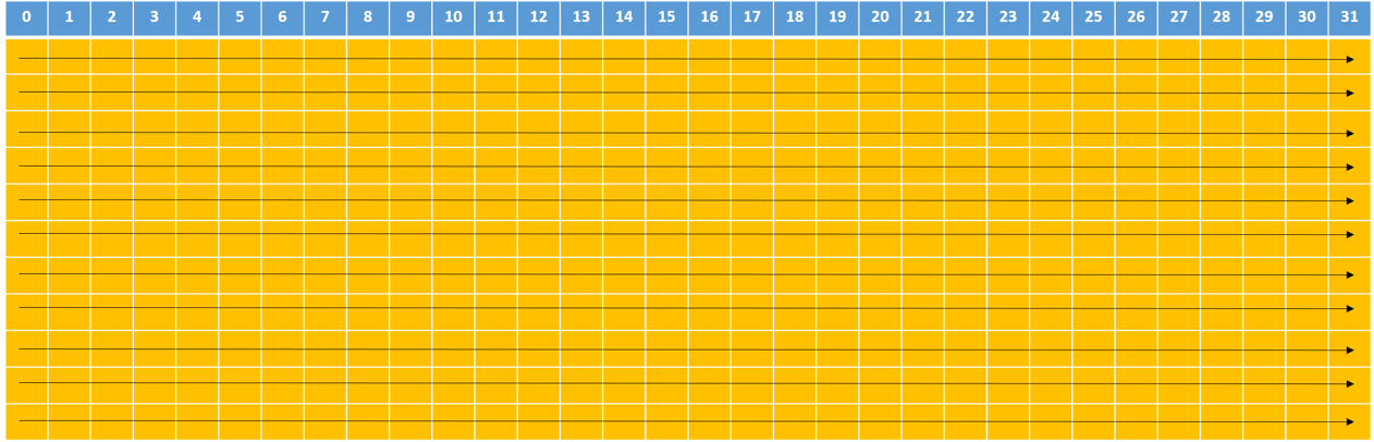 在共享内存中,连续的32-bits字被分配到连续的32个bank中,这就像电影院的座位一样:一列的座位就相当于一个bank,所以每行有32个座位,在每个座位上可以“坐”一个32-bits的数据(或者多个小于32-bits的数据,如4个char型的数据,2个short型的数据);而正常情况下,我们是按照先坐完一行再坐下一行的顺序来坐座位的,在shared memory中地址映射的方式也是这样的。下图中内存地址是按照箭头的方向依次映射的: