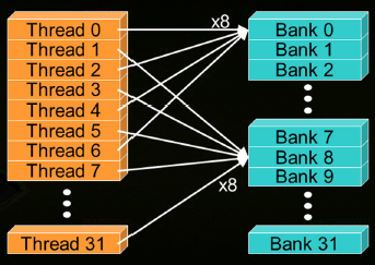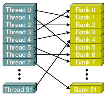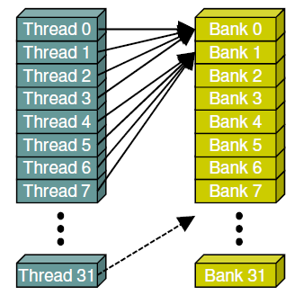 为了获得较高的内存带宽,共享存储器被划分为多个大小相等的存储器模块,称为bank,可以被同时访问。因此任何跨越b个不同的内存bank的对n个地址进行读取和写入的操作可以被同时进行,这样就大大提高了整体带宽 ——可达到单独一个bank带宽的b倍。但是很多情况下,我们无法充分发挥bank的功能,以致于shared memory的带宽非常的小,这可能是因为我们遇到了bank冲突。