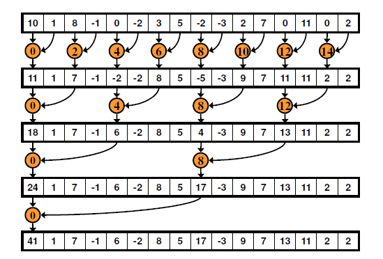 假设有一个大小为2048的向量,我们想用归约算法对该向量求和。于是我们申请了一个大小为1024的线程块,并声明了一个大小为2048的共享内存数组,并将数据从全局内存拷贝到了该共享内存数组。