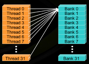 上图中,所有的线程都访问了同一个bank,貌似产生了32路的bank冲突,但是由于广播(broadcast)机制(当一个warp中的所有线程访问一个bank中的同一个字(word)地址时,就会向所有的线程广播这个字(word)),这种情况并不会发生bank冲突。
