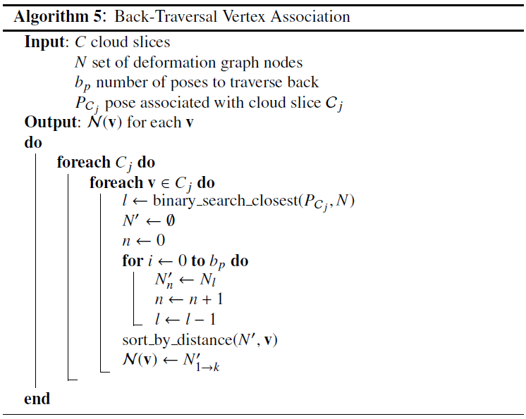 每个volume 中抽取点在 pose graph 中找连接点时,首先根据抽取点对应的 pose graph 点找到相邻的点,在找到的相邻点后,再和最近的 k 个相邻点建立连接,算法如下: