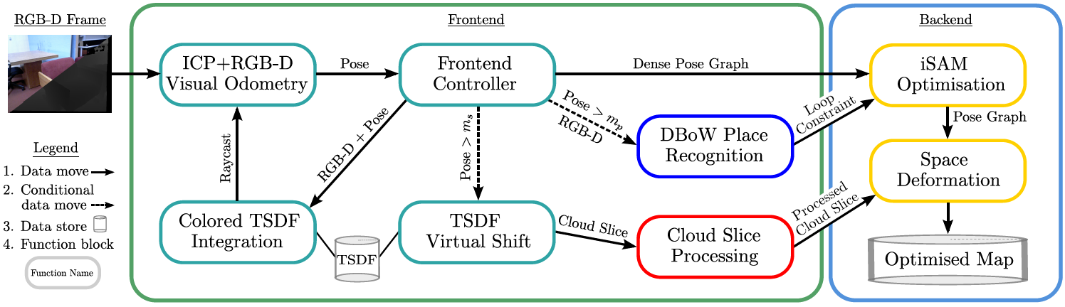 系统总的流程图如上所示,整个系统分为前端和后端,其中前端包括 相机位姿估计、场景点提取。后端包括回环检测、iSAM 算法位姿优化, deformation graph 优化和场景点更新。