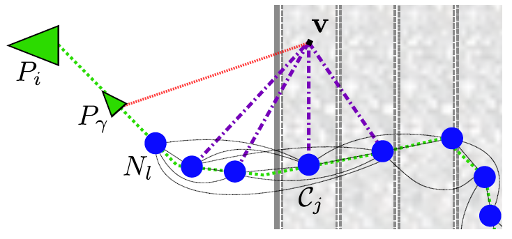 表示相机移动距离大时从 volume 中提取出来的三维点,紫色线表示三维点和 pose graph 也就是和 deformation graph 中四个点相连接,pose graph 中的点会和也会和相邻的点连接。点 v 实际是在 volume 移动 Pγ 处从 volume 中提取出来的,带你 v 寻找 pose graph 中连接点的算法是根据 Pγ找到相邻 pose graph 中的点,再找 pose graph 相邻的点中找距离最相近的点,然后和距离最相近的点建立连接。