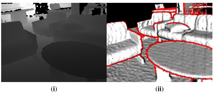 由于 RGB 相机的深度图像校准问题和 light diffraction 的影响,closed object 边缘估计的颜色值通常不准,在深度通道处这些边缘通常有 stark discontimuities,作者拒绝在深度图像处 strong boundaries 这些测量到的颜色值,边缘通过 7x7 邻域的深度图像计算得到,上图红色的部分显示的是拒绝的地方,在颜色值融合的时候,按照surface normal 和相机光心的夹角进行加权融合,目标的表面和相平面越是平行,加权的时候权值越大。