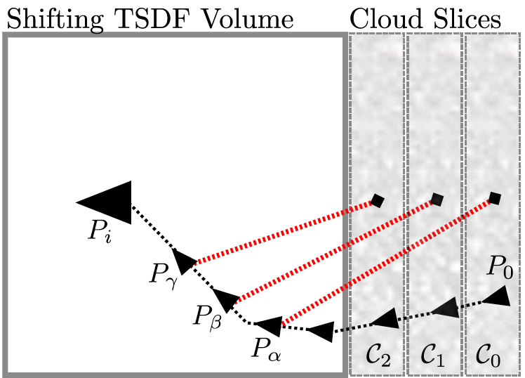 volume 每次移动的适合会在 volume 中将不在相机光心附近网格处三维点从 volume 中提取出来,提取算法是在和坐标轴相同的三个方向上检测在 volume 中网格从正到负或者从负到正的穿越点,并且将这些穿越点在网格模型中提取出来,也就是重建好的场景点。