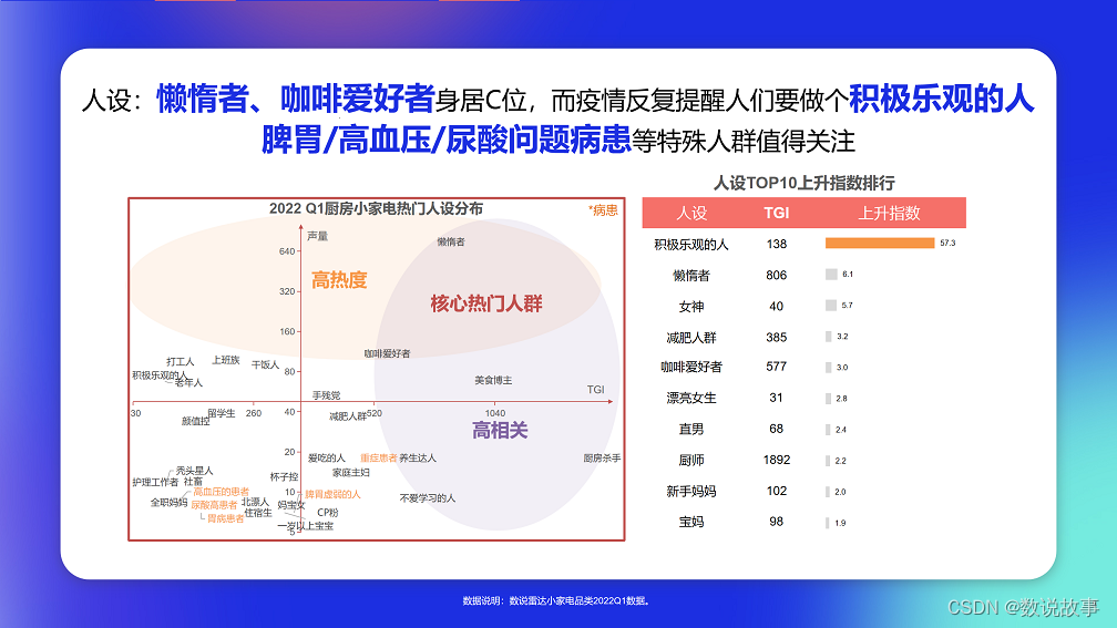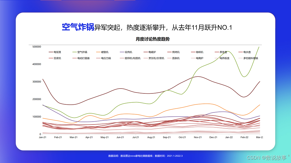 本文探讨了小家电市场在'懒人经济'、'单身经济'和宅经济影响下的发展,重点关注空气炸锅的热潮、健康属性产品的崛起,以及面对的产品挑战与市场机遇。数说故事的《2022年Q1小家电行业趋势报告》揭示了行业趋势、消费者行为和创新方向,包括无油烹饪、跨界营销等热点。