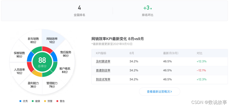 然后不同车企可根据实际业务设计适合自身的健康度评估规则,例如将区域内各个经销门店的满意度得分排名,以“优秀”,“健康”,“预警”,“高危”将区域内经销店的健康度划分为四个等级,实现以数据驱动经销店定位问题,对标分析原因,做出行动改善问题。