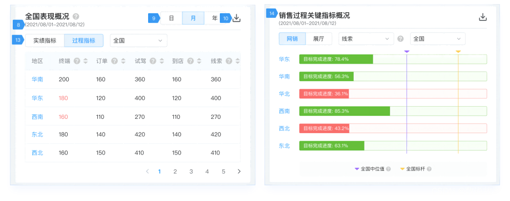 以试驾到成交环节的诊断预警为例,某车企华南大区9月份在试驾意向客户量充足的情况下,实际订车订单量却环比8月份增长不及预期,同比去年9月份试驾下定转化率下降;除了与本区域对比外,华南大区9月份意向客户下定业绩排名在各区域中下降,试驾下定转化率低于总部大盘均值,基于预警模型配置,华南大区收到试驾下定转化率下降预警。