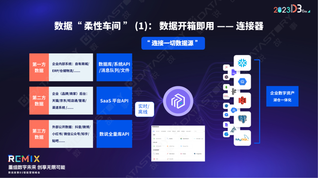 顺着这个思路,数说故事打造了「模块化装配车间」。在数据集成方面,这个平台内置了一方数据、二方数据、三方数据的连接器,只要通过简单的配置就可以打通全域的数据。