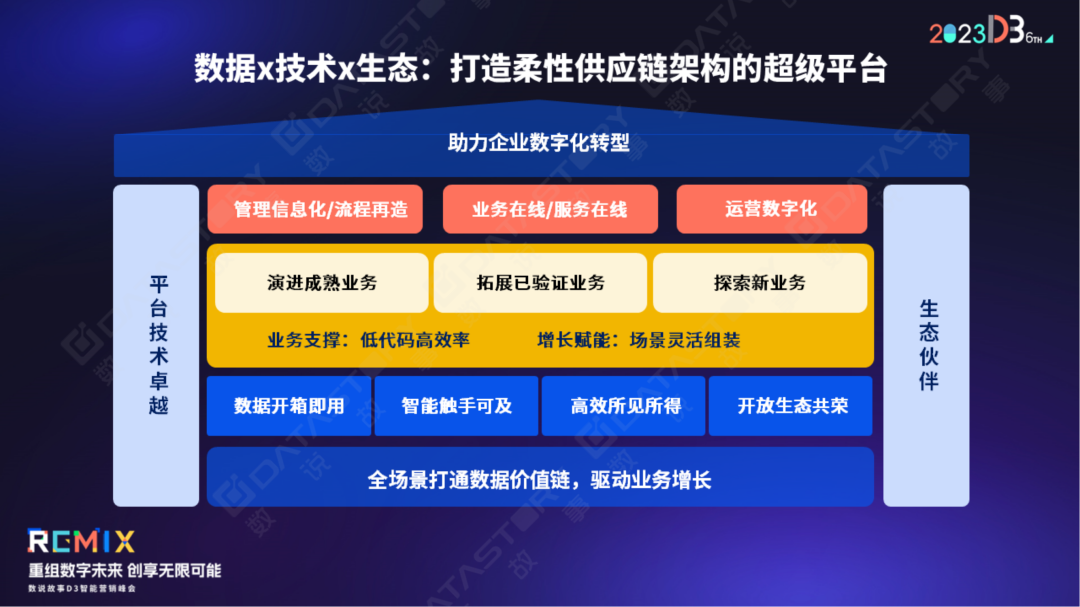 面对瞬息万变的国内外环境,现代企业和品牌面临着多重难题,如消费升级、流量红利消失、大环境压力围困的存量博弈以及消费触点变化等。面对这些问题,企业到底要怎么做才能实现跨越式发展?为此,数说故事CTO李旭日提出:“打造一个高效的数字化「柔性供应链」平台。高生产率必须要有高效的平台,通过这个平台来降低技术门槛,让更多业务人员能深度参与企业数字化转型。同时,需要集群力思考如何提高管理信息化水平,避免技术问题干扰数字化转型,以提升企业市场竞争力和可持续发展。”