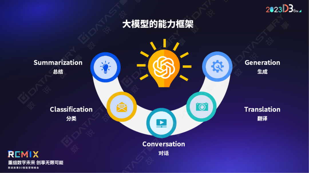 谈及“平台+AI”,数说故事CTO李旭日表示:“今年有一个绕不开的话题就是ChatGPT。以ChatGPT为主导的大模型,如果在商业领域的话,我们认为大模型能给数说故事带来这几方面的能力,第一个是翻译,第二个是分类,第三个是生成,第四个是总结,第五个是对话。”