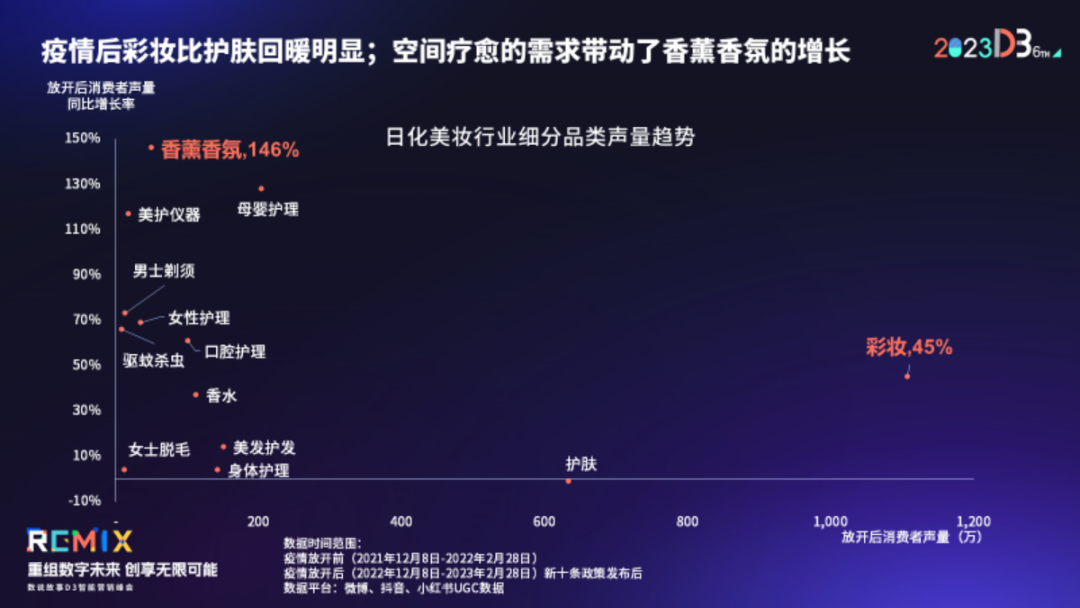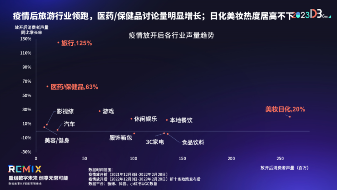 数说故事VP孙淑娟从数据中发现:“在疫情前和疫情后,我们发现旅游回暖明显,增幅125%,同时医药、保健品持续受关注,增长63%;日化美妆热度最高,大基数下仍然增长20%;此外,我们洞察到娱乐自己和享受生活相关的细分场景,正在快速增长。而对于一些比较刚需的,比如说家电、箱包等等,声量是处于一个平稳的状态。”