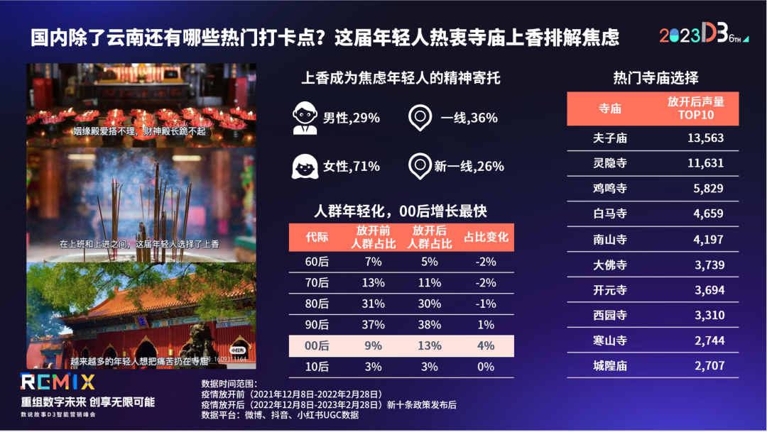 数说故事VP孙淑娟发现了一组有趣的数据:“这届年轻人在上进和上班之间选择了上香,其中一线城市占比36%,女性占比71%,00后增长最快。为什么?他们想把焦虑能够缓解到神这个领域去,像夫子庙、灵隐寺等,都是年轻人最近常去的地方。”