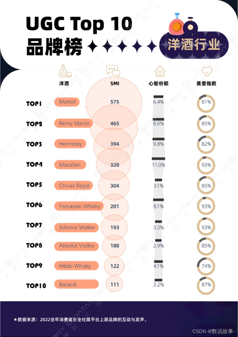 基于消费者社媒心智模型,数说故事率先针对护肤、彩妆、休闲零食、饮料、洋酒、啤酒及汽车7大行业,发布社媒心智指数SMI位于行业前10的品牌榜单。从美誉指数和心智份额的综合得分来看,位于所属细分行业首位的分别是:欧莱雅、圣罗兰、旺旺、康师傅、Martell、乌苏、蔚来汽车。